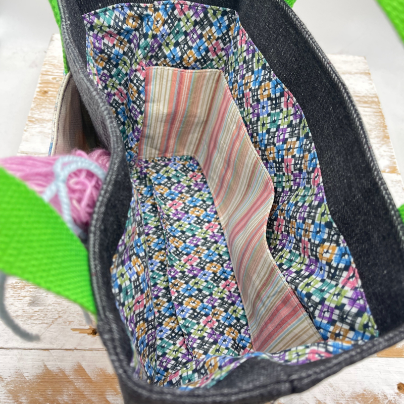 Binnenin heeft de tas verschillende vakken (8 in totaal) waar je bijvoorbeeld je brei- haaknaalden, schaar, centimeter in kan bewaren.